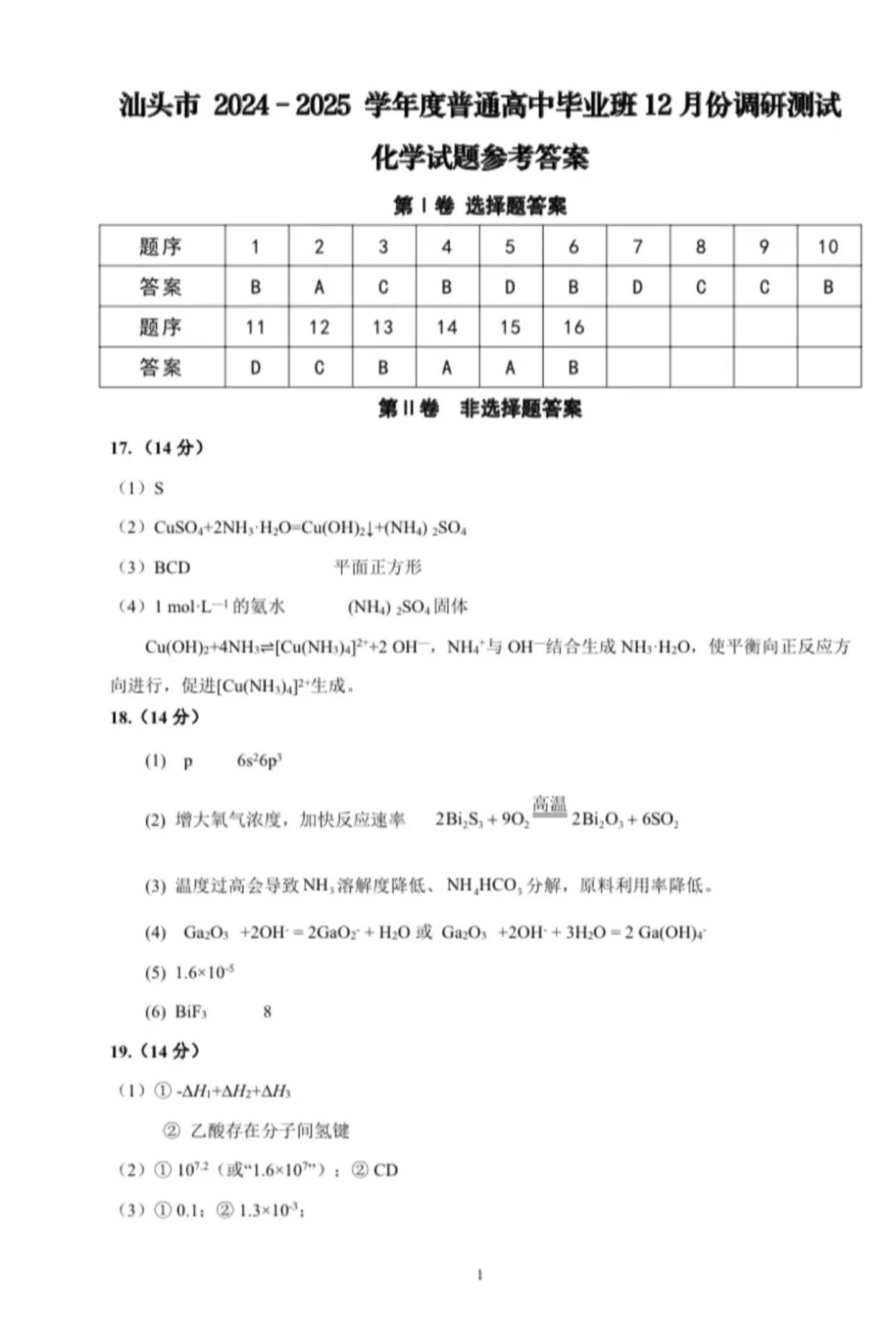 广东省汕头市2025届高三上学期12月期末教学质量监测化学答案