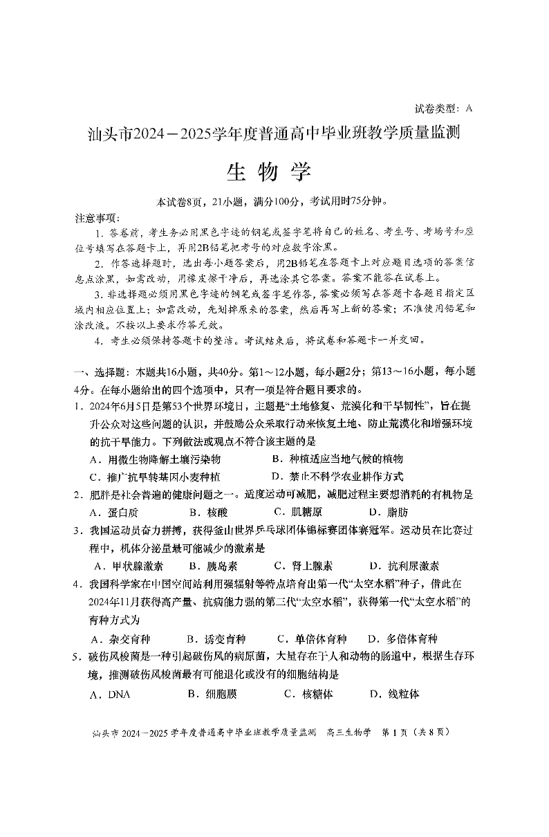 广东省汕头市2025届高三上学期12月期末教学质量监测生物