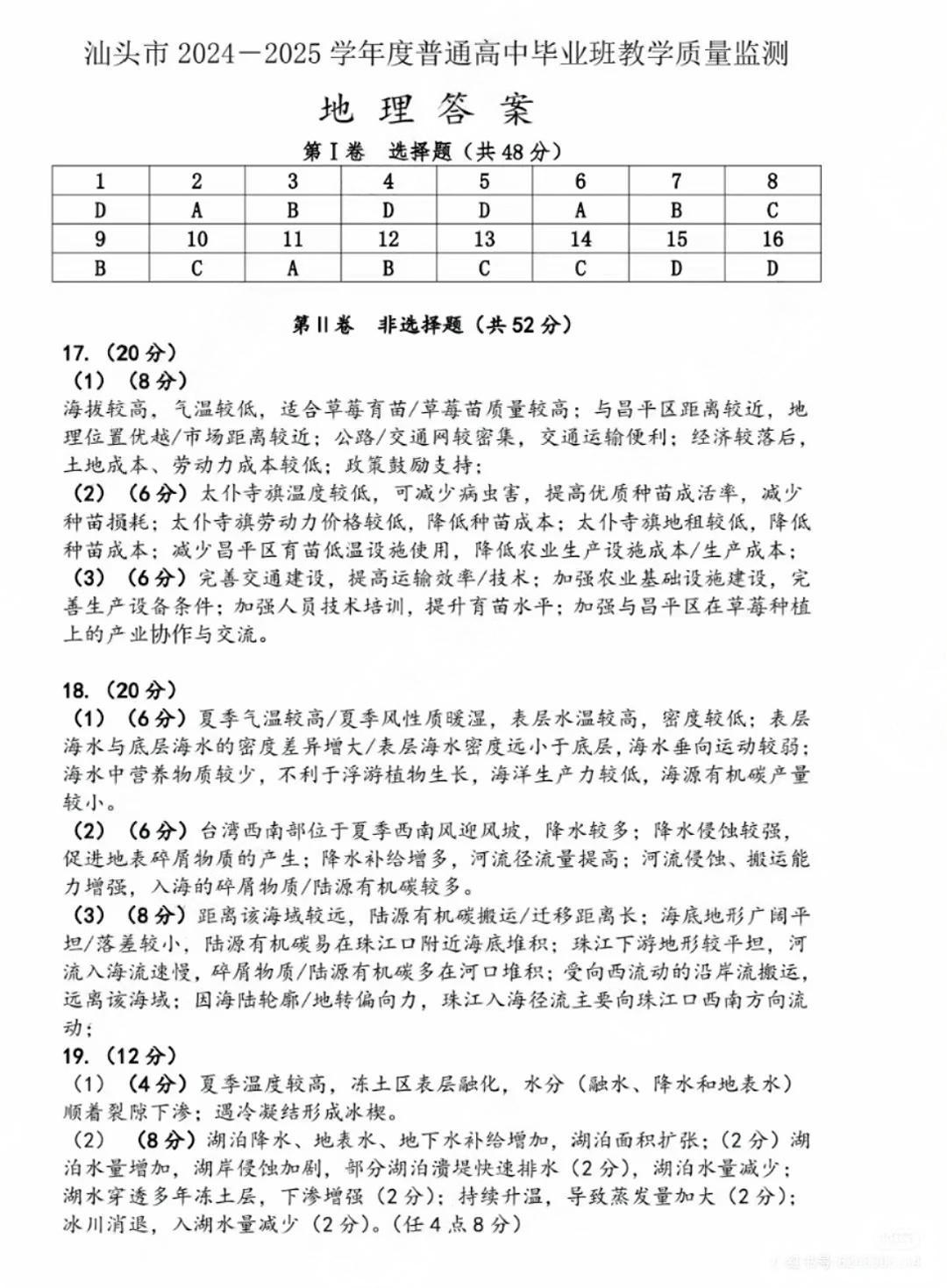 广东省汕头市2025届高三上学期12月期末教学质量监测地理答案