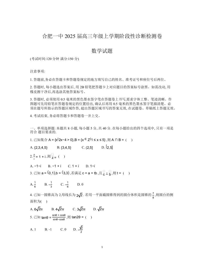 安徽省合肥市第一中学2025届高三上学期阶段性诊断检测数学