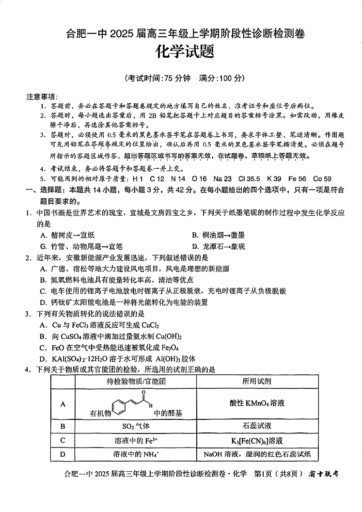 安徽省合肥市第一中学2025届高三上学期阶段性诊断检测化学