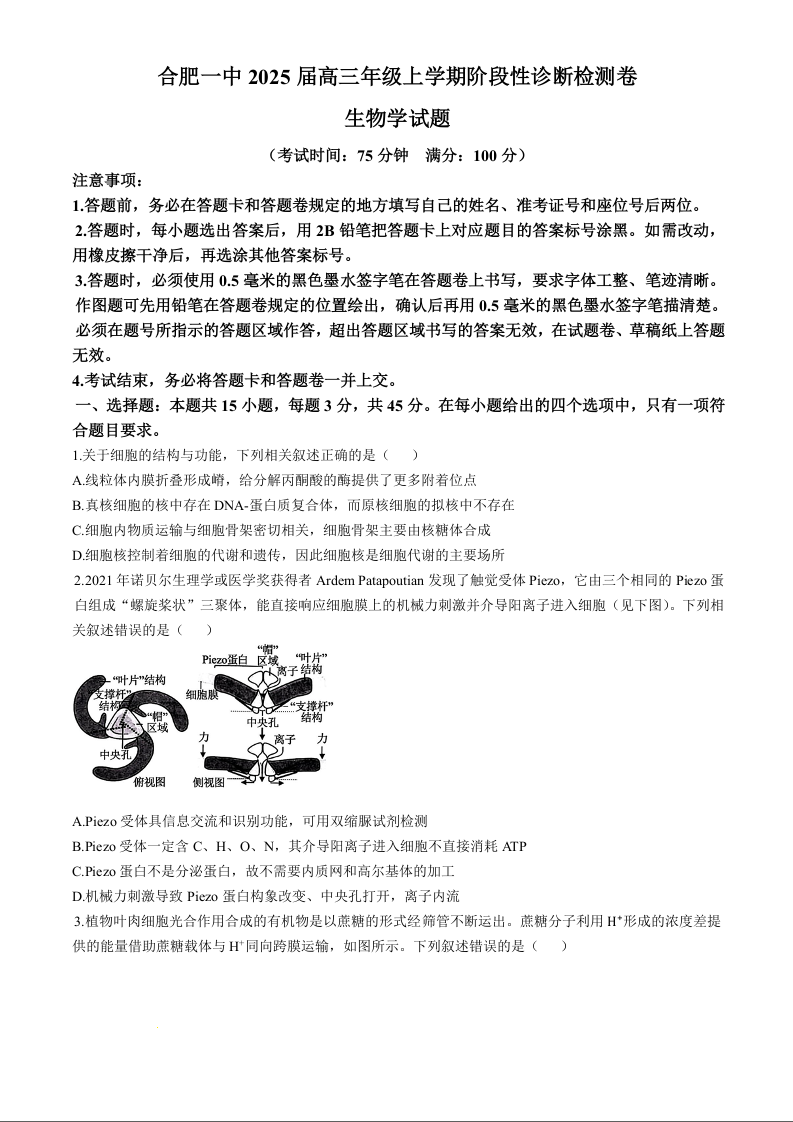 安徽省合肥市第一中学2025届高三上学期阶段性诊断检测生物+答案
