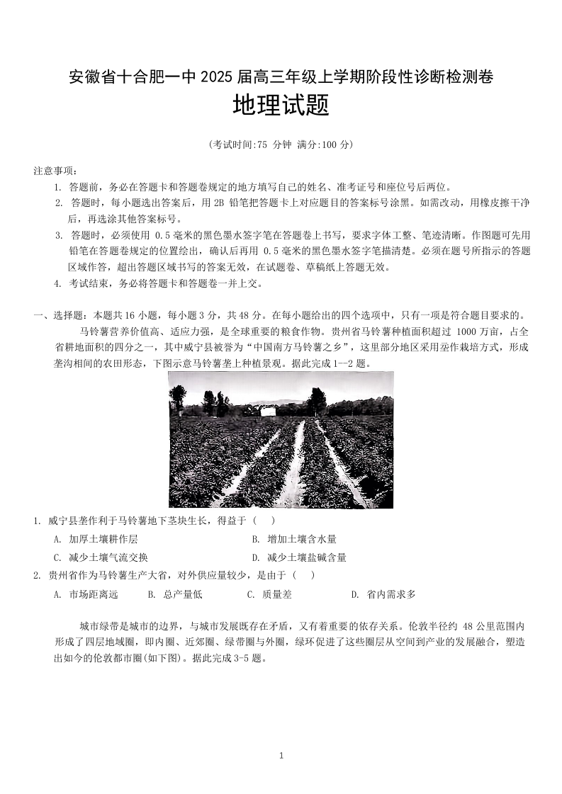 安徽省合肥市第一中学2025届高三上学期阶段性诊断检测地理