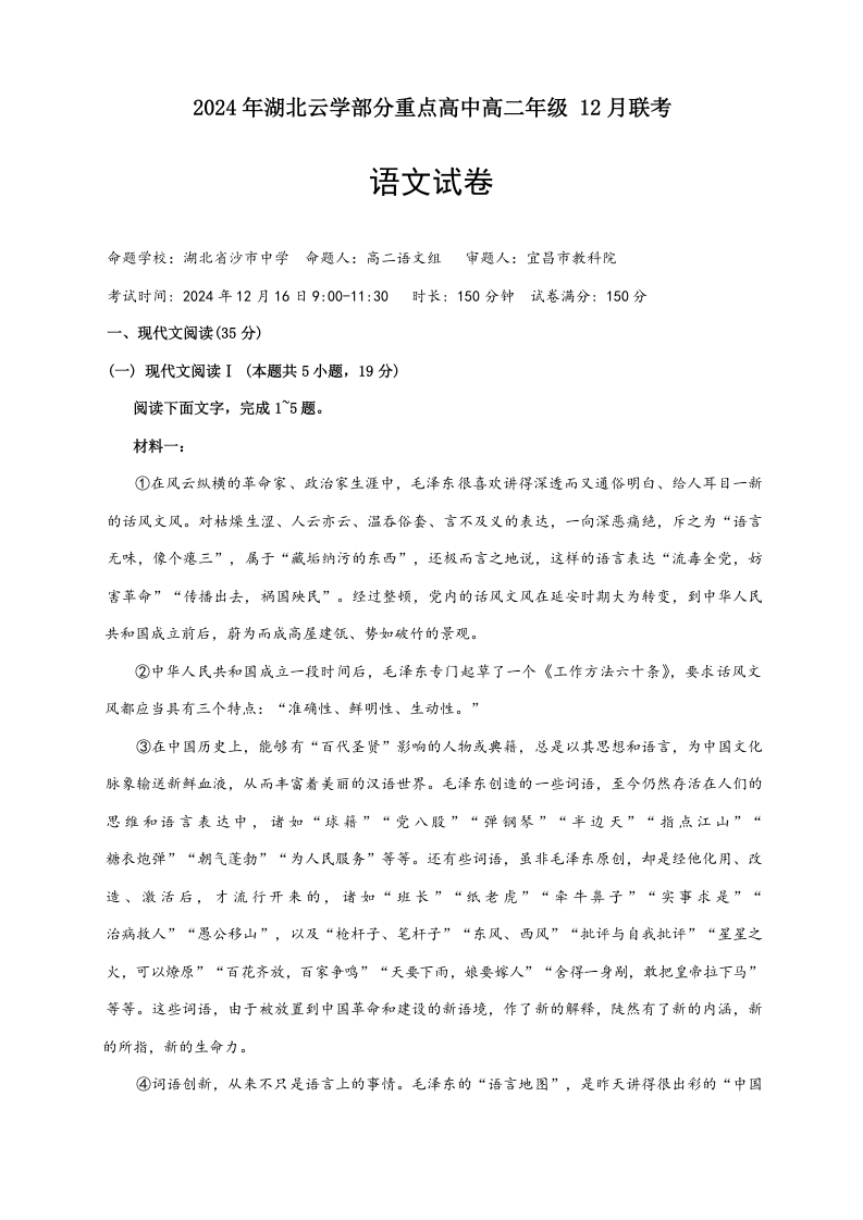 湖北省云学部分重点高中2024-2025学年高二上学期12月月考语文+答案