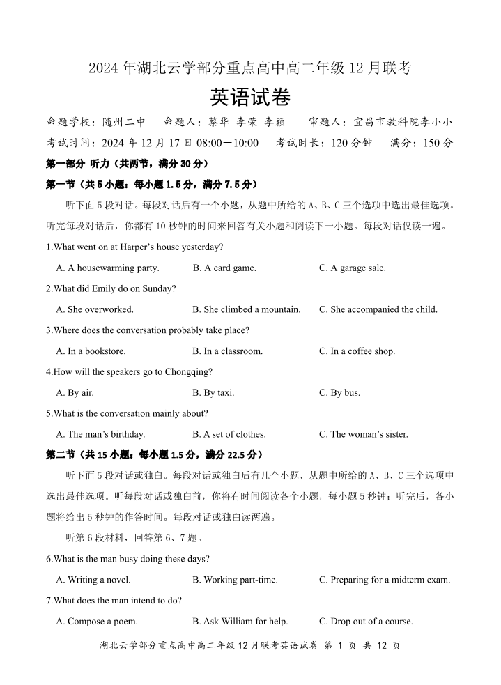 湖北省云学部分重点高中2024-2025学年高二上学期12月月考英语