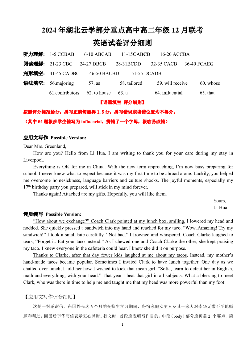 湖北省云学部分重点高中2024-2025学年高二上学期12月月考英语答案