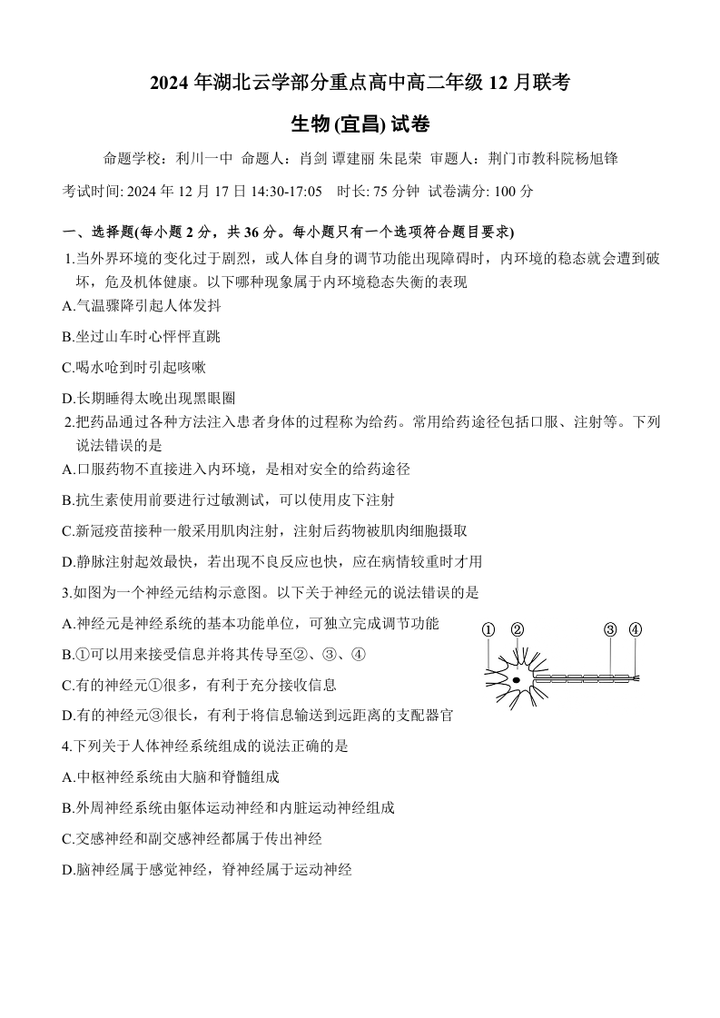 湖北省云学部分重点高中2024-2025学年高二上学期12月月考生物