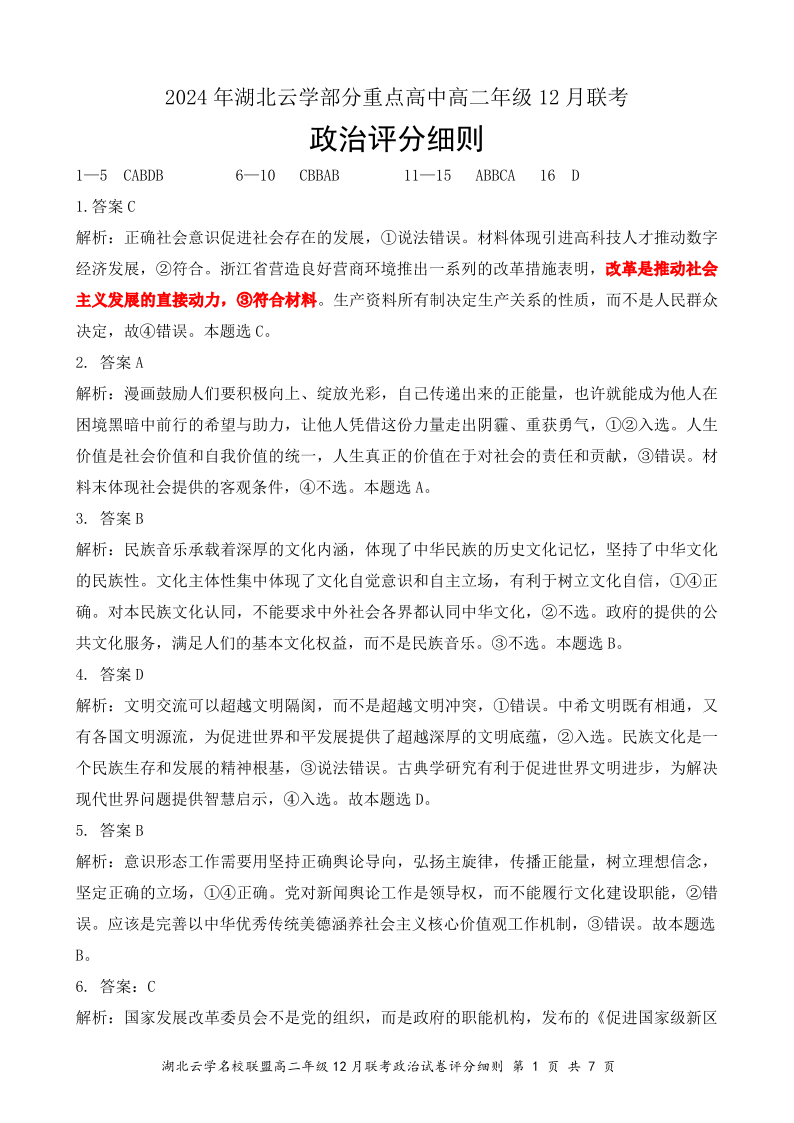 湖北省云学部分重点高中2024-2025学年高二上学期12月月考政治答案