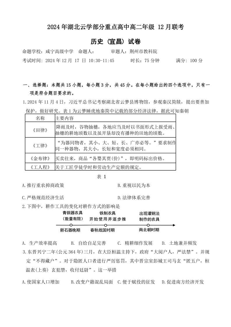 湖北省云学部分重点高中2024-2025学年高二上学期12月月考历史