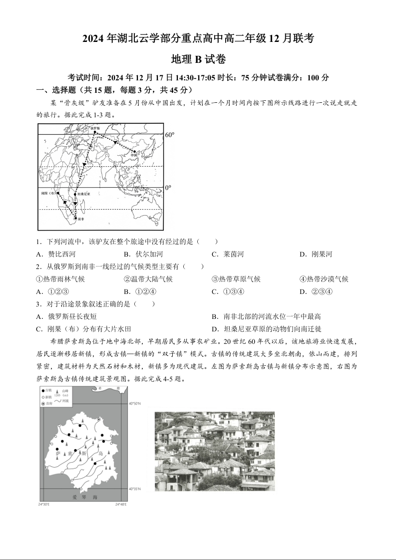 湖北省云学部分重点高中2024-2025学年高二上学期12月月考地理+答案