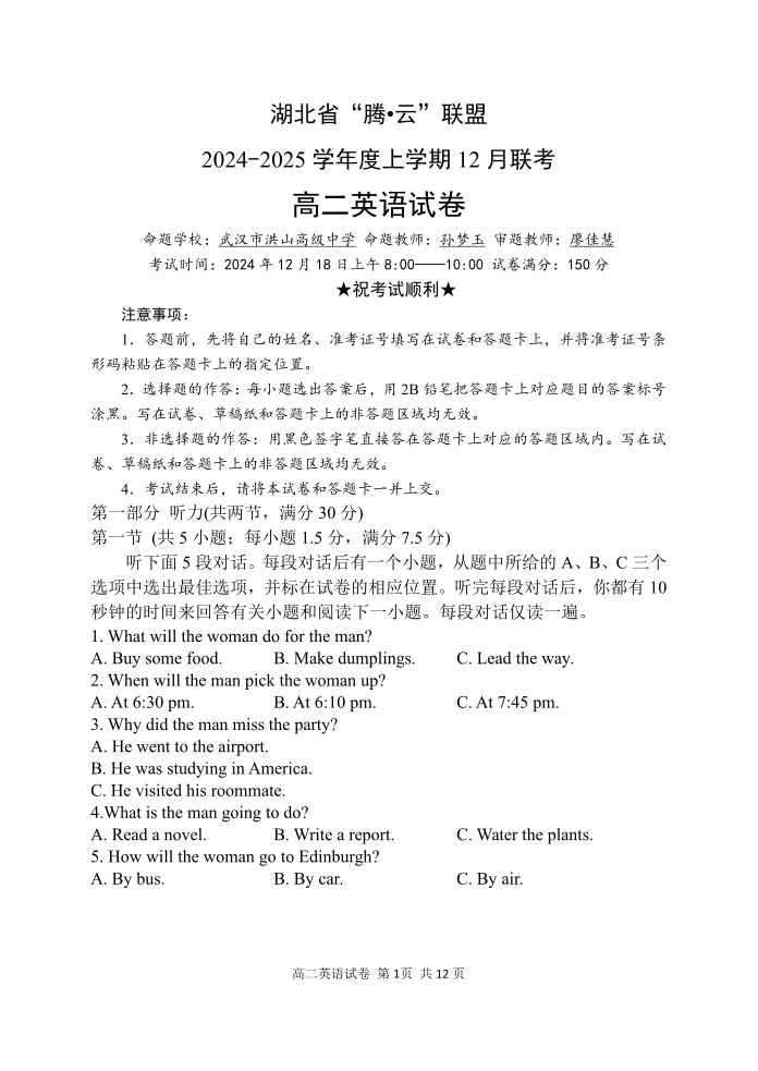 湖北省腾云联盟2024-2025学年高二上学期12月联考英语