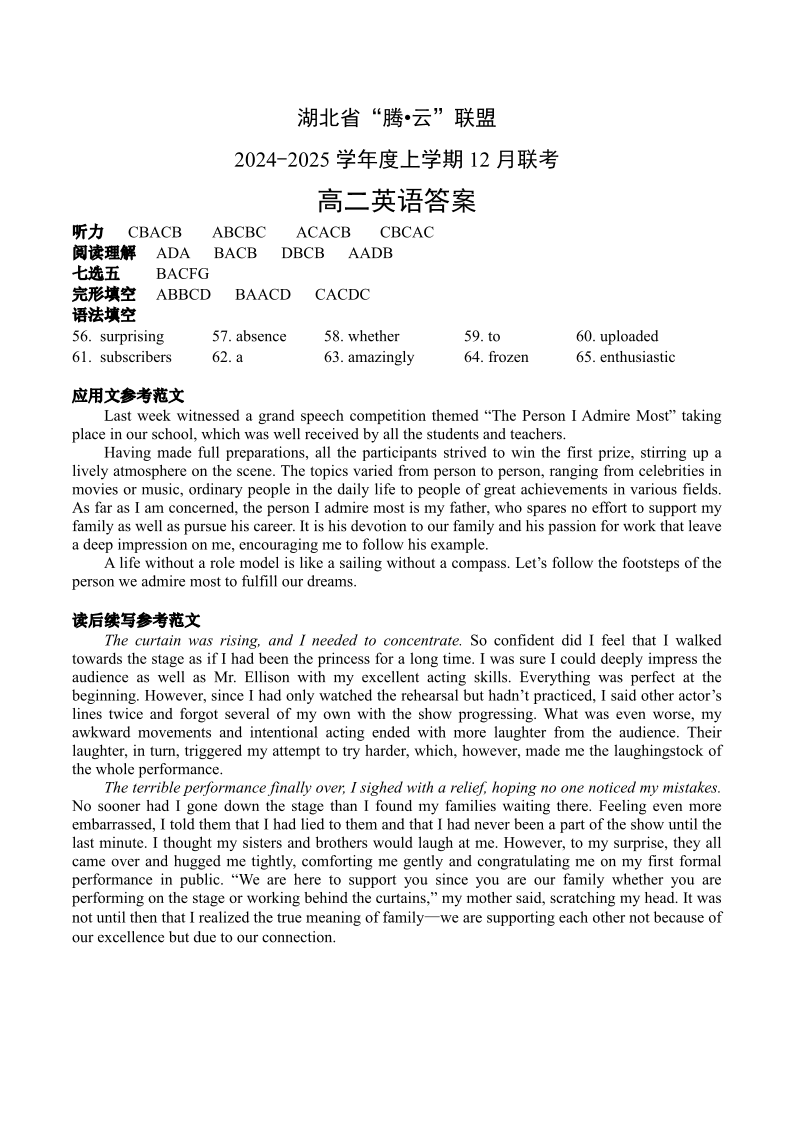 湖北省腾云联盟2024-2025学年高二上学期12月联考英语答案