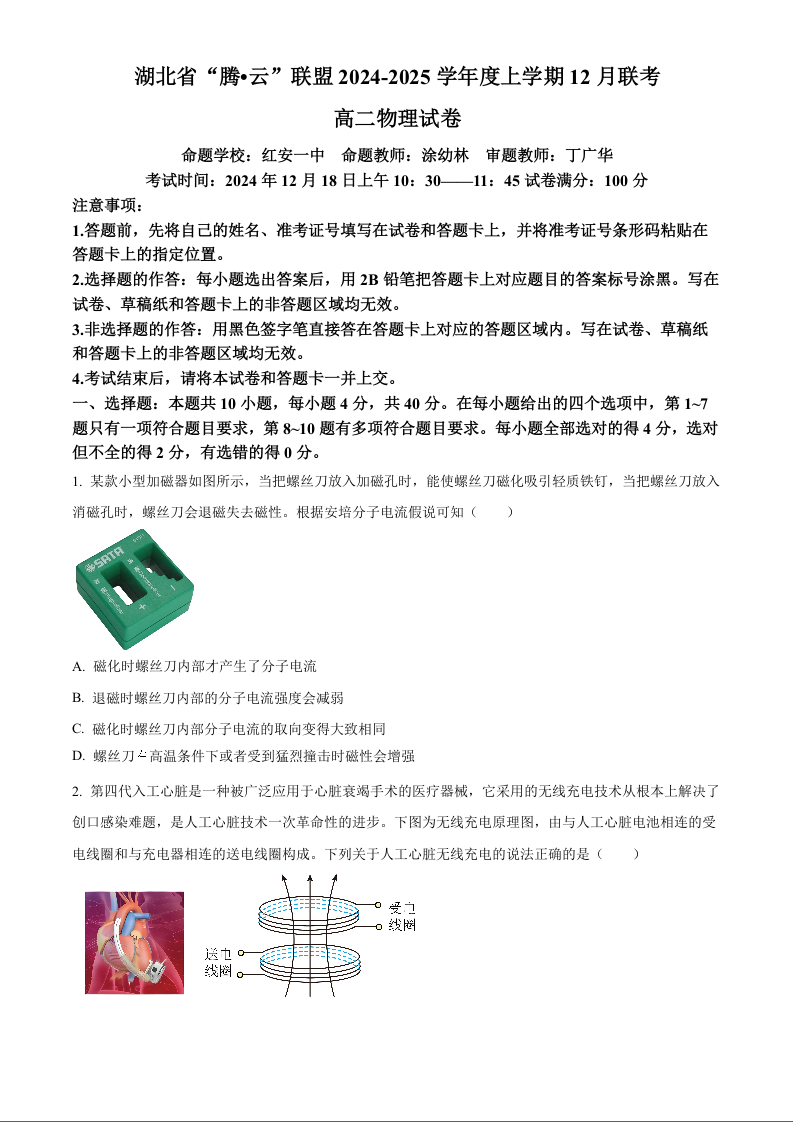 湖北省腾云联盟2024-2025学年高二上学期12月联考物理(原卷版)