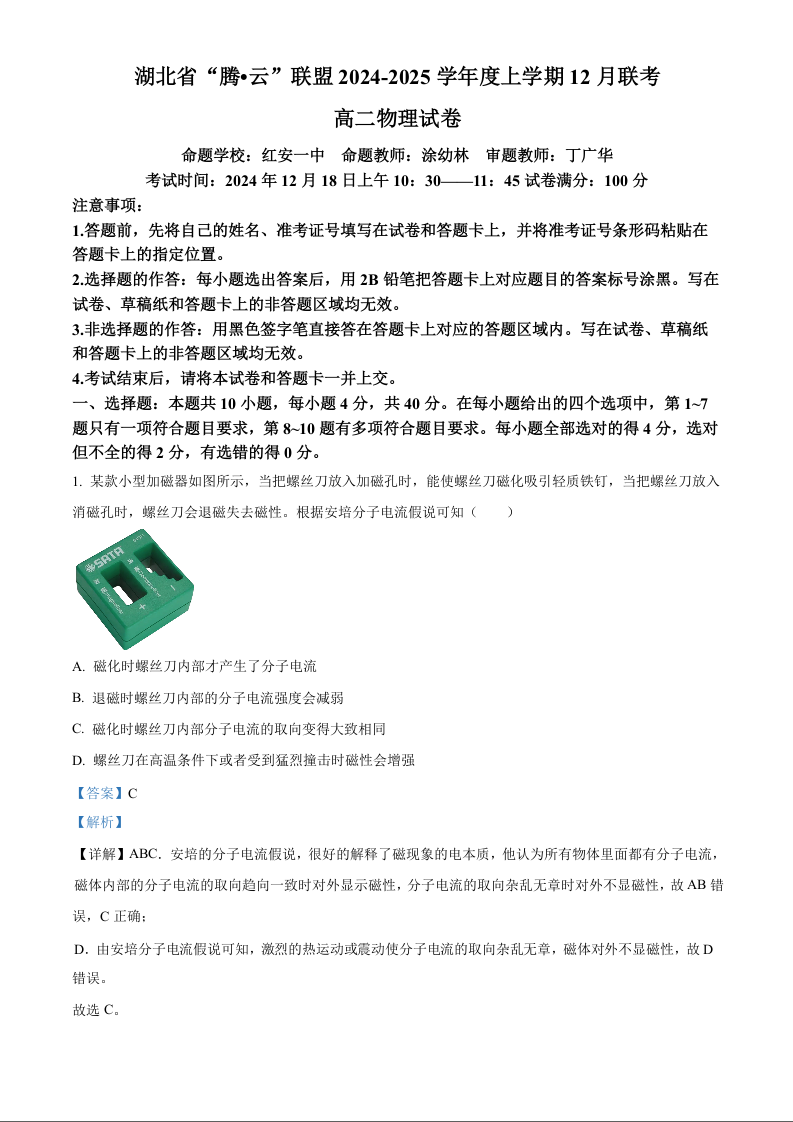 湖北省腾云联盟2024-2025学年高二上学期12月联考物理(解析版)