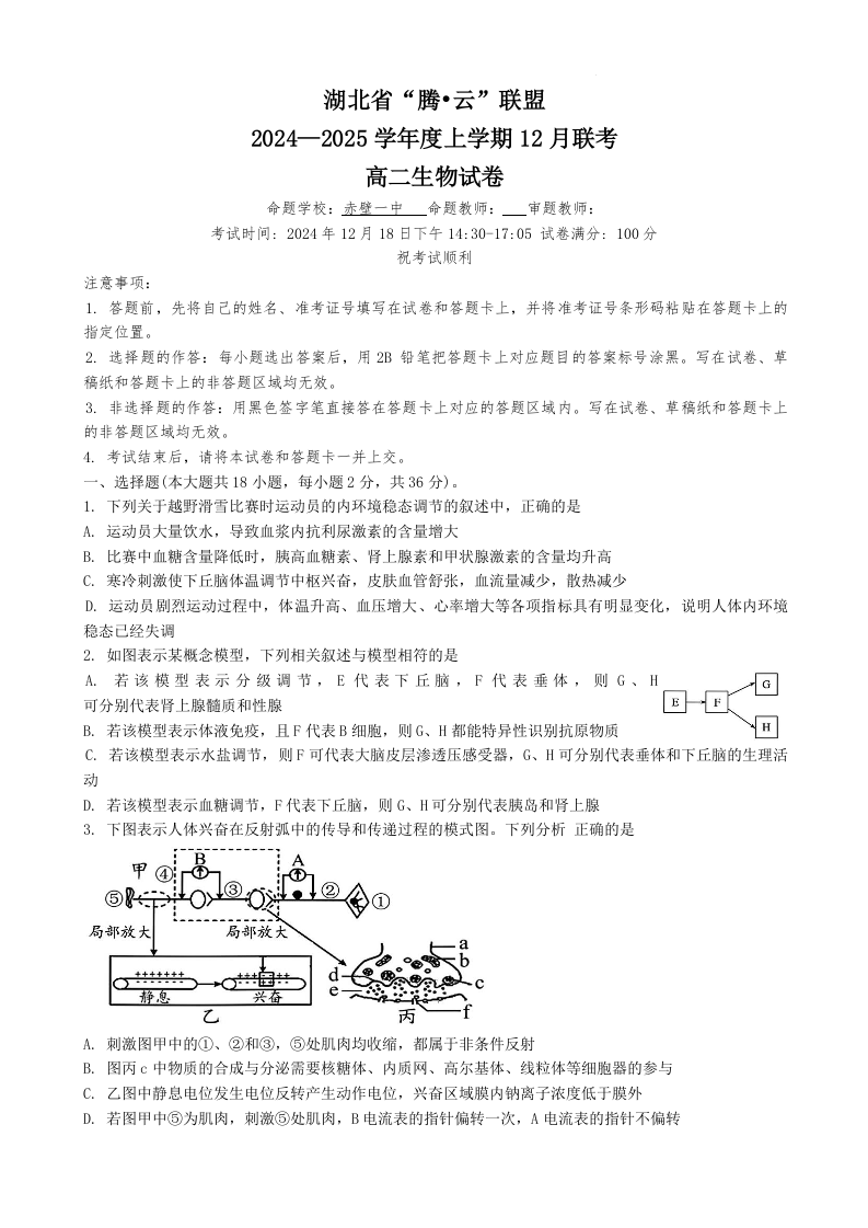 湖北省腾云联盟2024-2025学年高二上学期12月联考生物