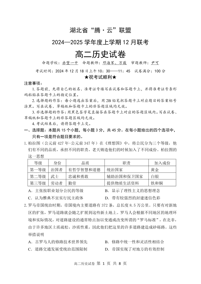 湖北省腾云联盟2024-2025学年高二上学期12月联考历史