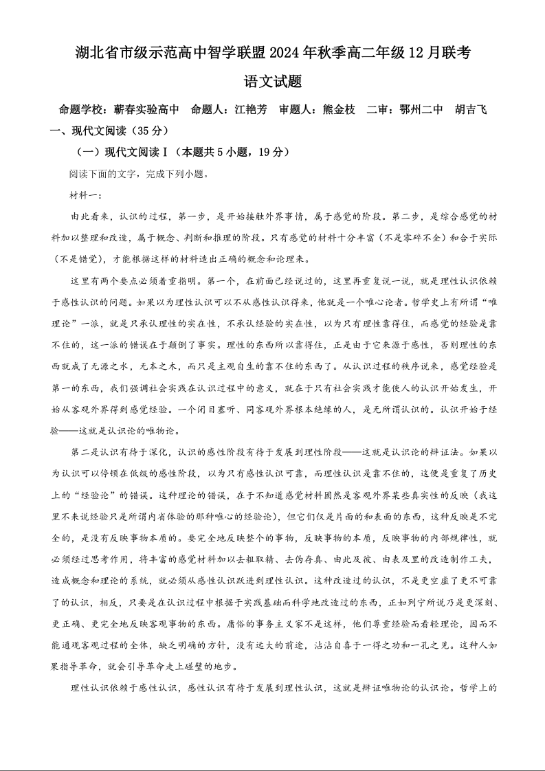 湖北省市级示范高中智学联盟 2024-2025学年高二上学期12月联考语文(解析版)