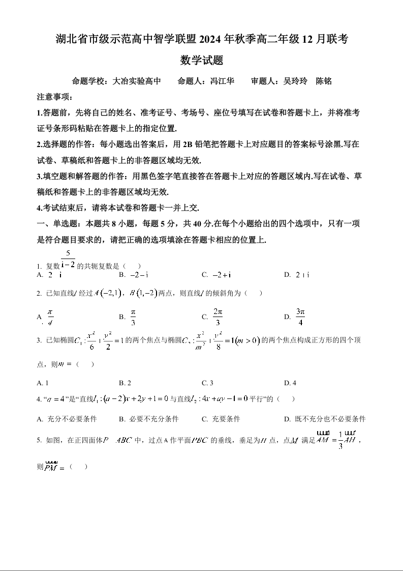 湖北省市级示范高中智学联盟 2024-2025学年高二上学期12月联考数学(原卷版)