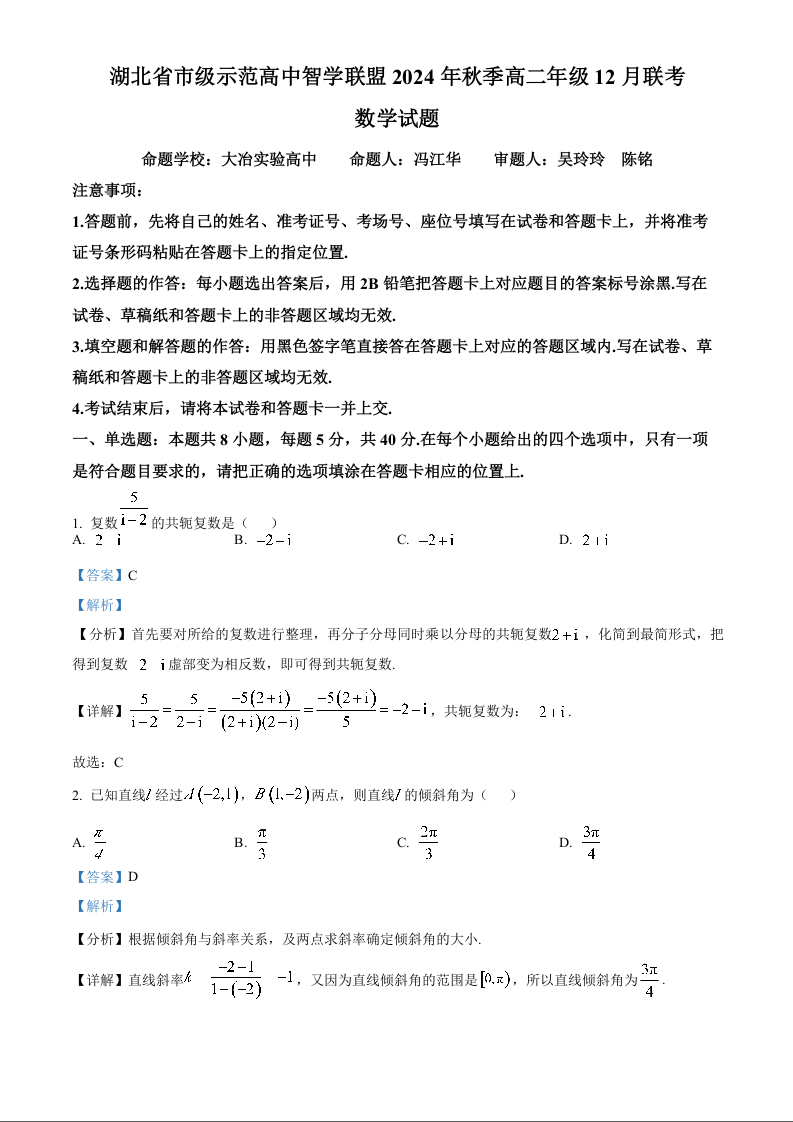 湖北省市级示范高中智学联盟 2024-2025学年高二上学期12月联考数学(解析版)