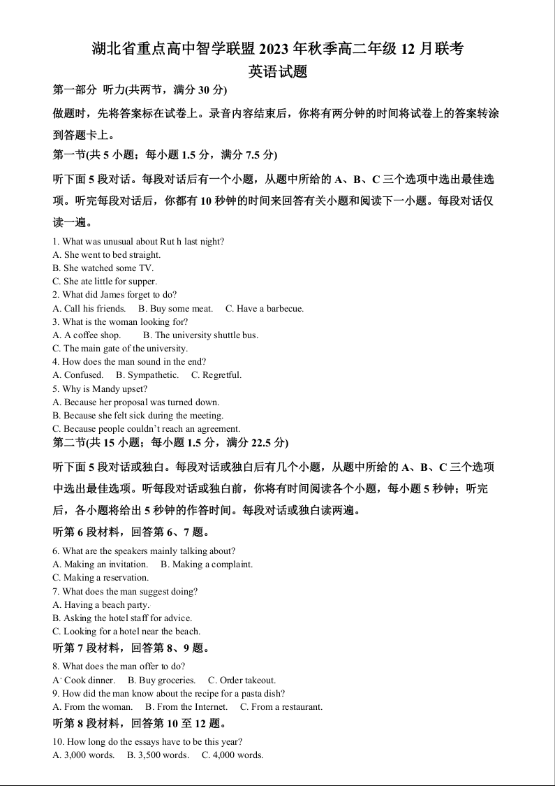 湖北省市级示范高中智学联盟 2024-2025学年高二上学期12月联考英语+答案