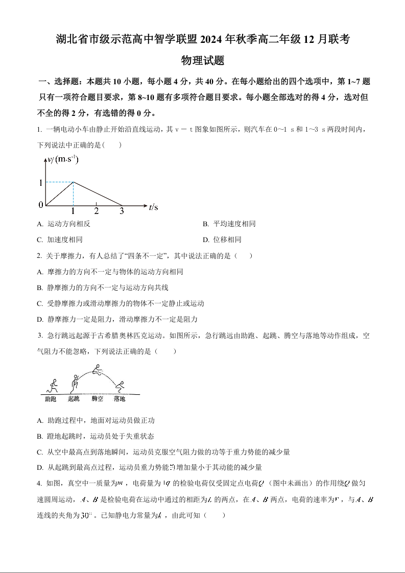 湖北省市级示范高中智学联盟 2024-2025学年高二上学期12月联考物理(原卷版)