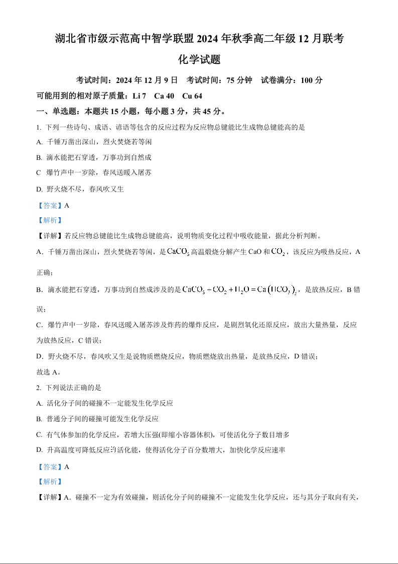 湖北省市级示范高中智学联盟 2024-2025学年高二上学期12月联考化学(解析版)