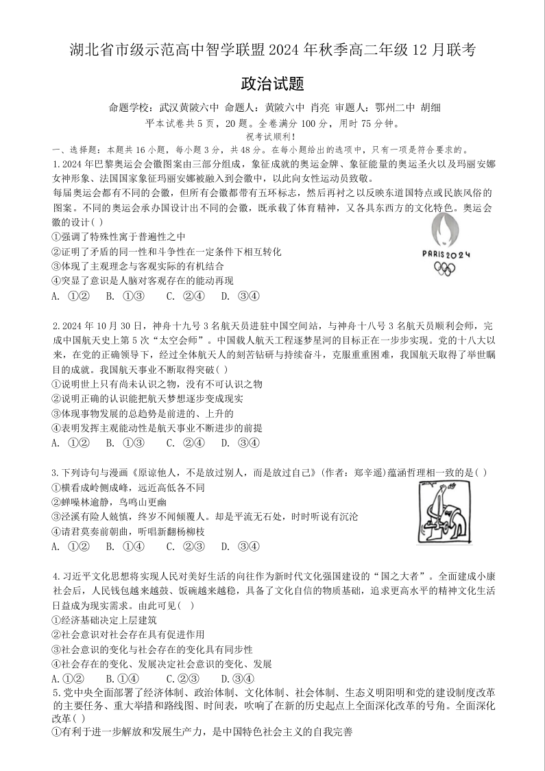 湖北省市级示范高中智学联盟 2024-2025学年高二上学期12月联考政治