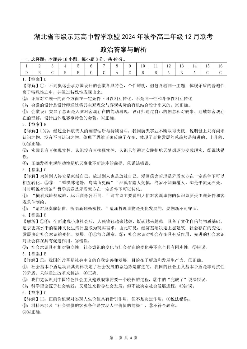 湖北省市级示范高中智学联盟 2024-2025学年高二上学期12月联考政治答案