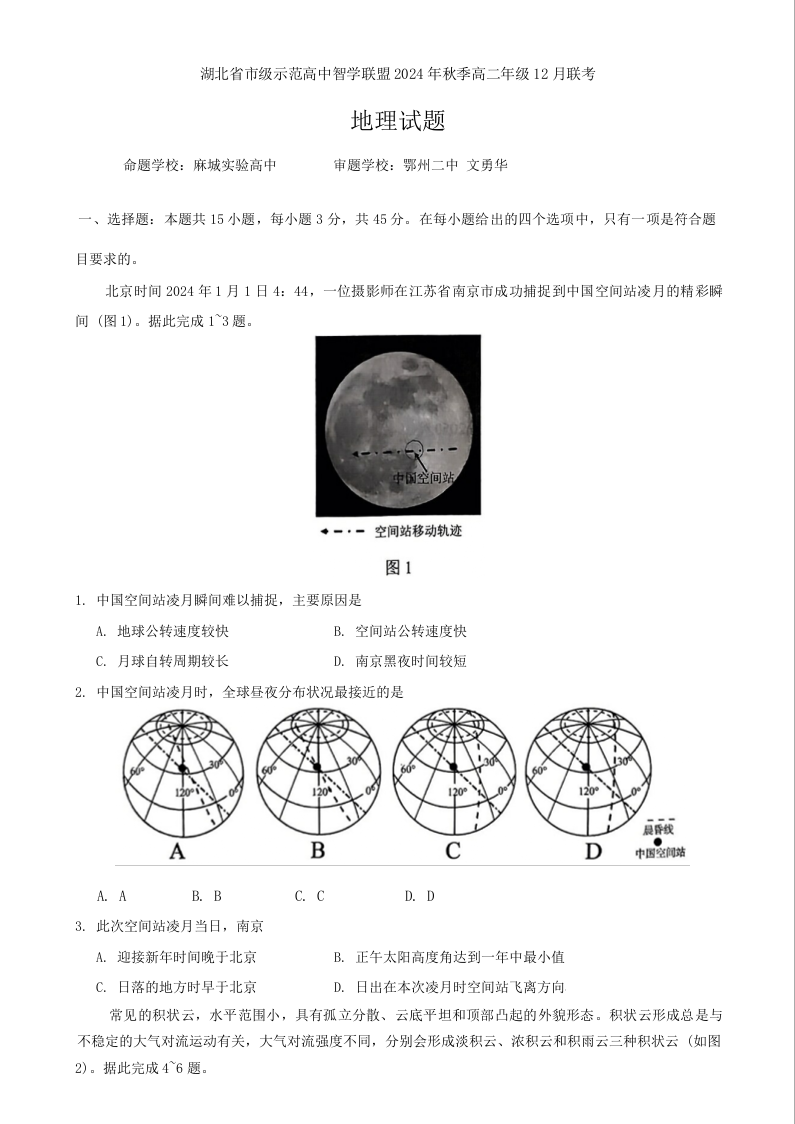 湖北省市级示范高中智学联盟 2024-2025学年高二上学期12月联考地理