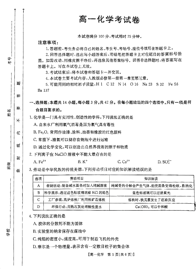 云南省昆明市五华区2024-2025学年高一上学期12月月考化学