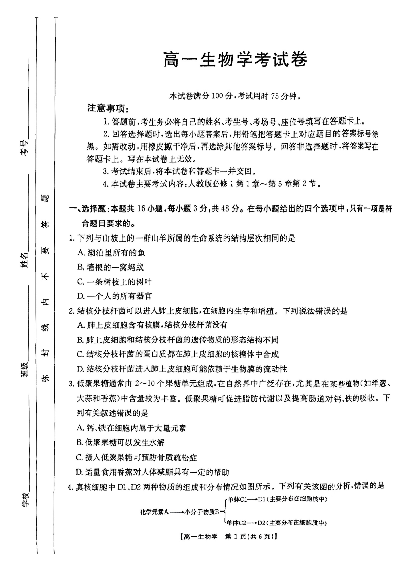 云南省昆明市五华区2024-2025学年高一上学期12月月考生物
