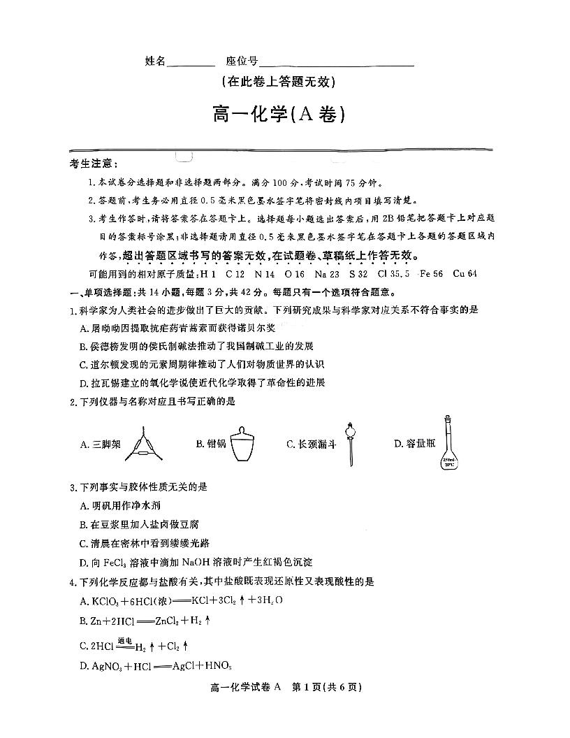 安徽省皖江名校2024-2025学年高一上学期12月联考化学A+答案