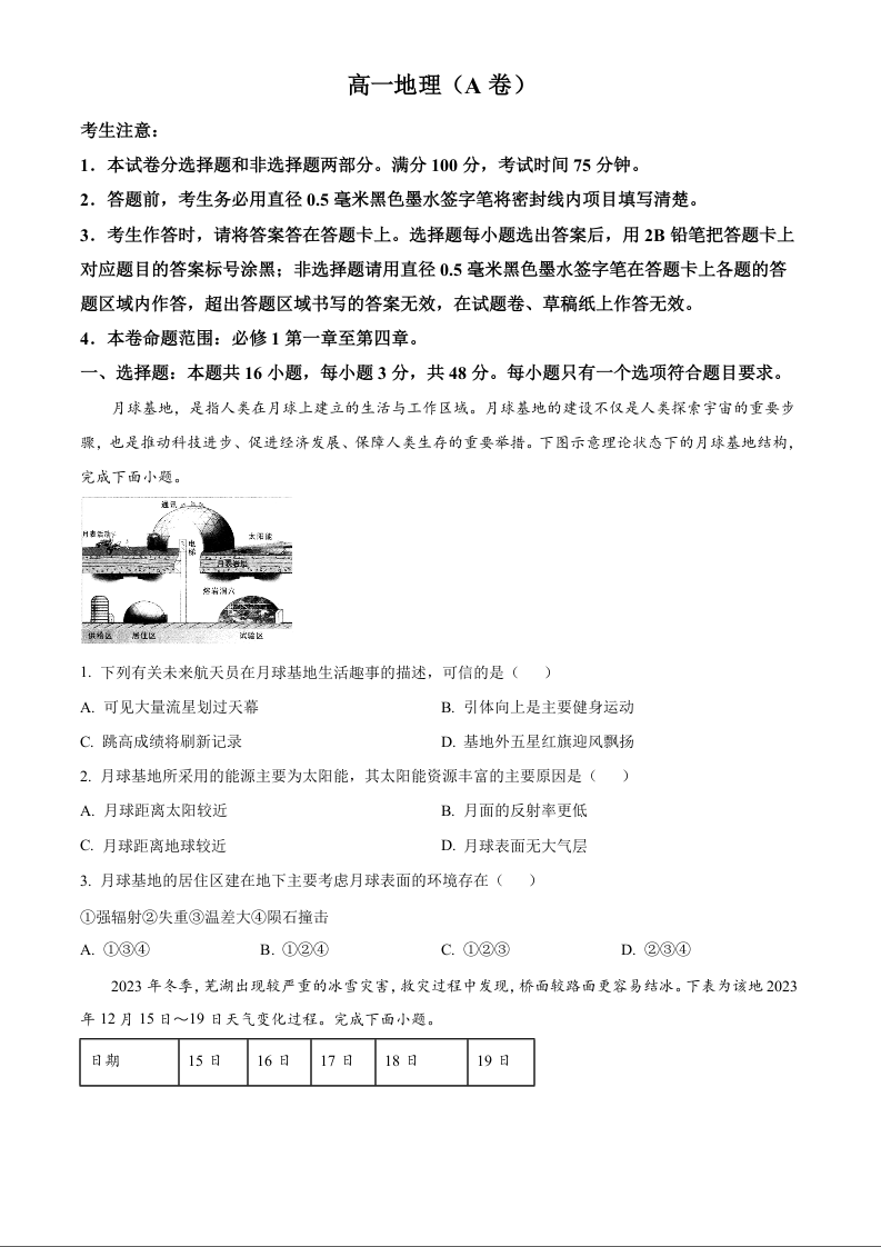 安徽省皖江名校2024-2025学年高一上学期12月联考地理A+答案