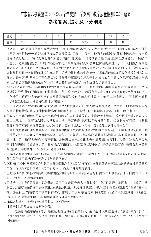 广东省清远市八校联盟2024-2025学年高一上学期教学质量检测(二)语文答案