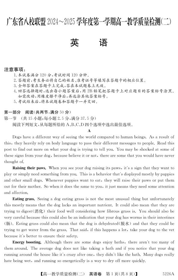 广东省清远市八校联盟2024-2025学年高一上学期教学质量检测(二)英语