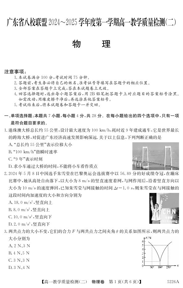 广东省清远市八校联盟2024-2025学年高一上学期教学质量检测(二)物理