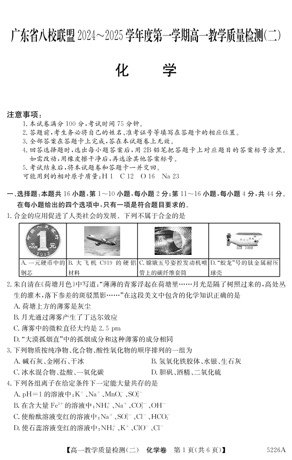 广东省清远市八校联盟2024-2025学年高一上学期教学质量检测(二)化学