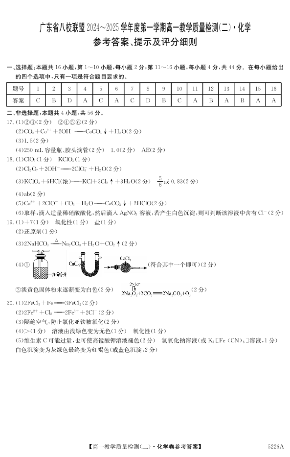 广东省清远市八校联盟2024-2025学年高一上学期教学质量检测(二)化学答案