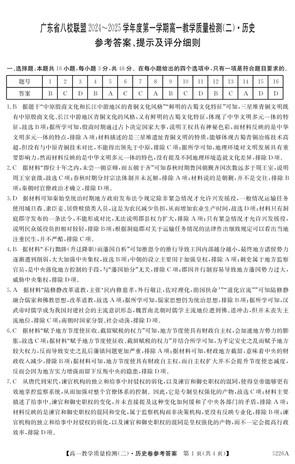 广东省清远市八校联盟2024-2025学年高一上学期教学质量检测(二)历史答案