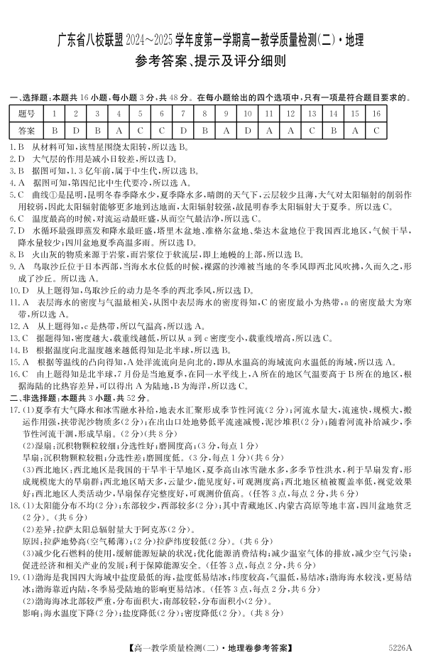 广东省清远市八校联盟2024-2025学年高一上学期教学质量检测(二)地理答案