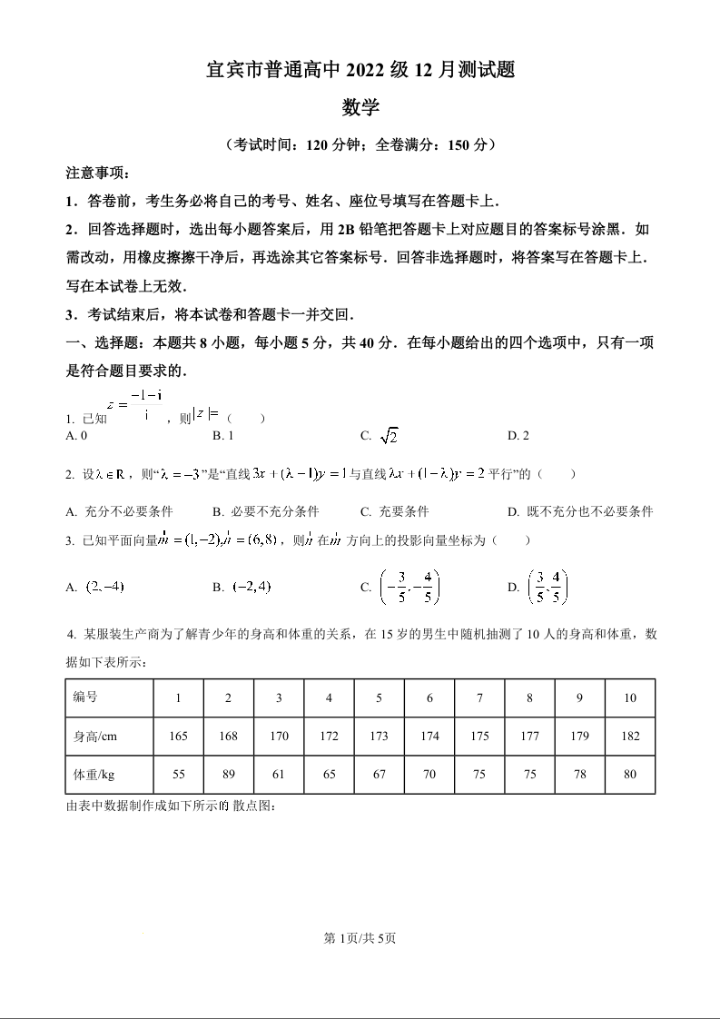 四川省宜宾市普通高中2025届高三上学期12月测试数学(原卷版)