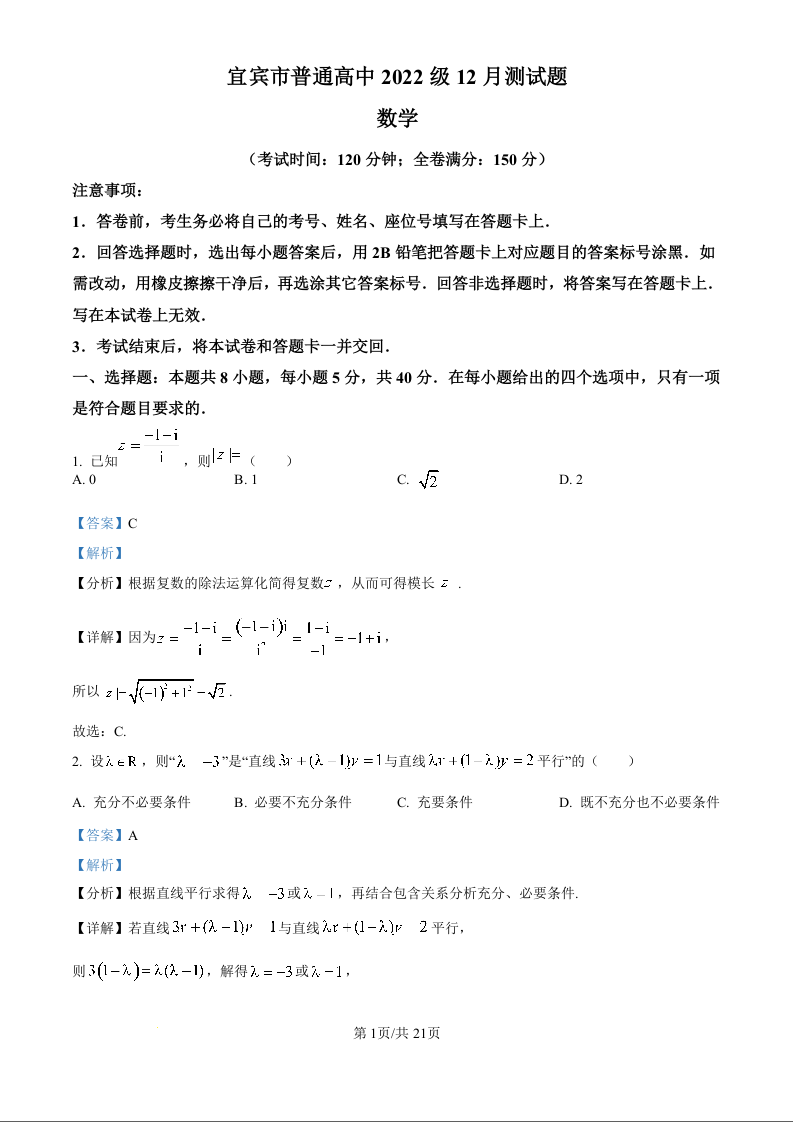 四川省宜宾市普通高中2025届高三上学期12月测试数学(精品解析版)