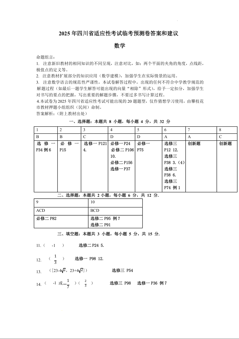 四川省2025届适应性考试临考预测(8+2+4+6结构20题新题型)数学答案和建议