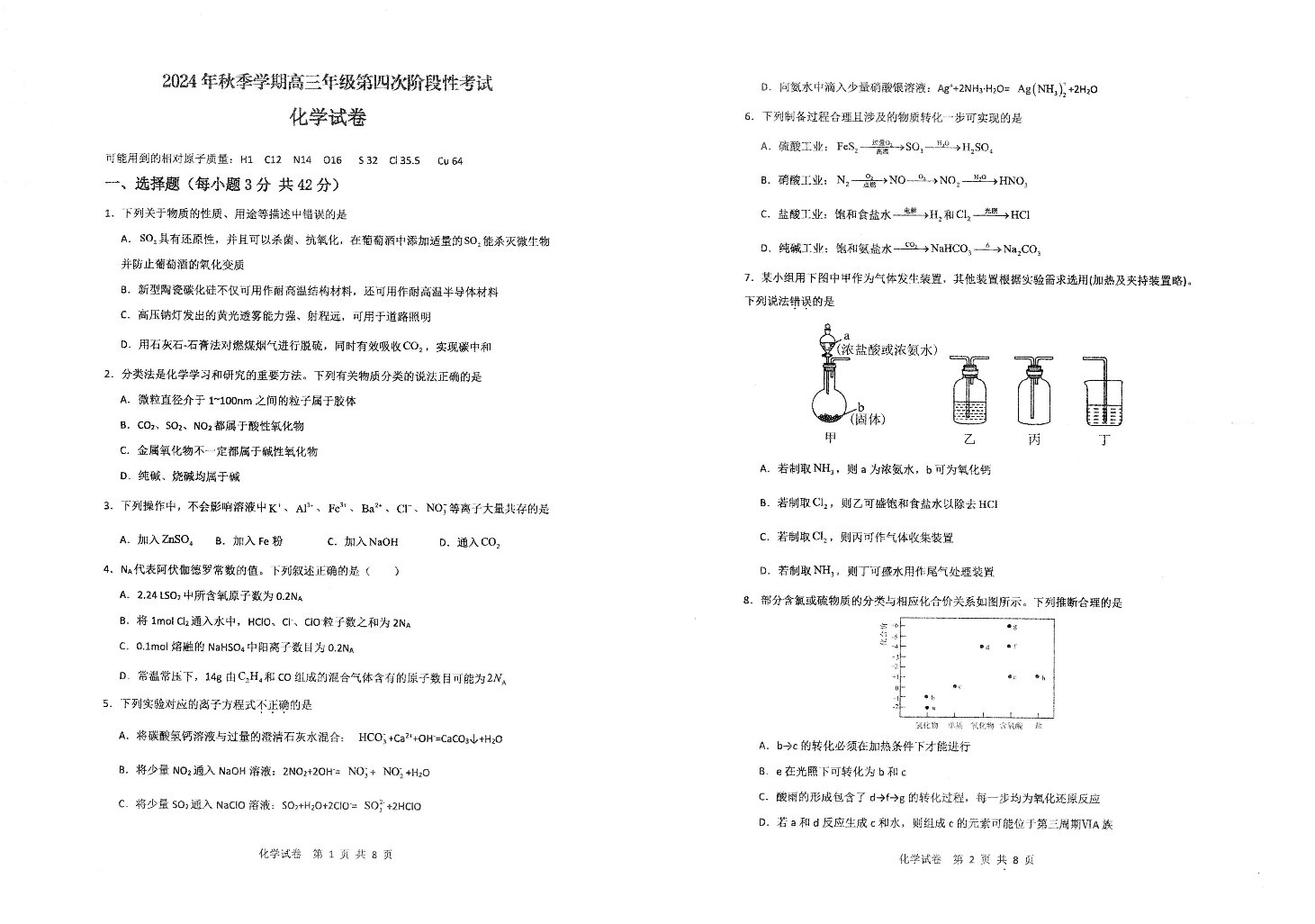 甘肃省平凉市一中等高中2025届高三上学期第四次阶段性考试化学
