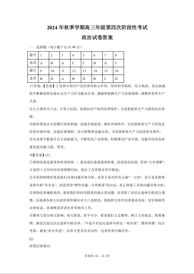 甘肃省平凉市一中等高中2025届高三上学期第四次阶段性考试政治答案