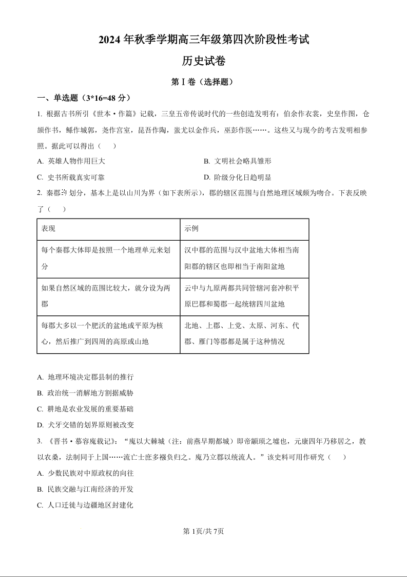 甘肃省平凉市一中等高中2025届高三上学期第四次阶段性考试历史(原卷版)