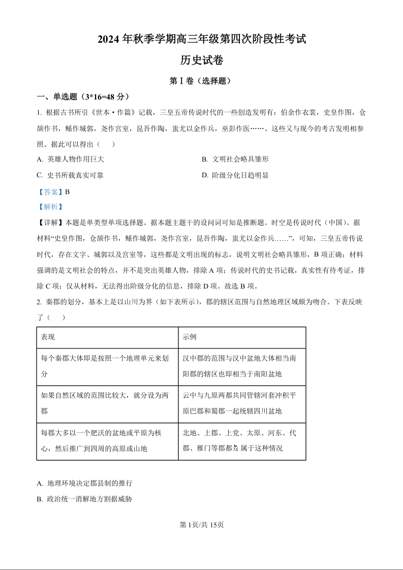 甘肃省平凉市一中等高中2025届高三上学期第四次阶段性考试历史(精品解析版)