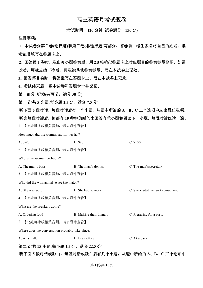 湖南省娄底市涟源市部分学校2025届高三上学期12月月考英语(原卷版)
