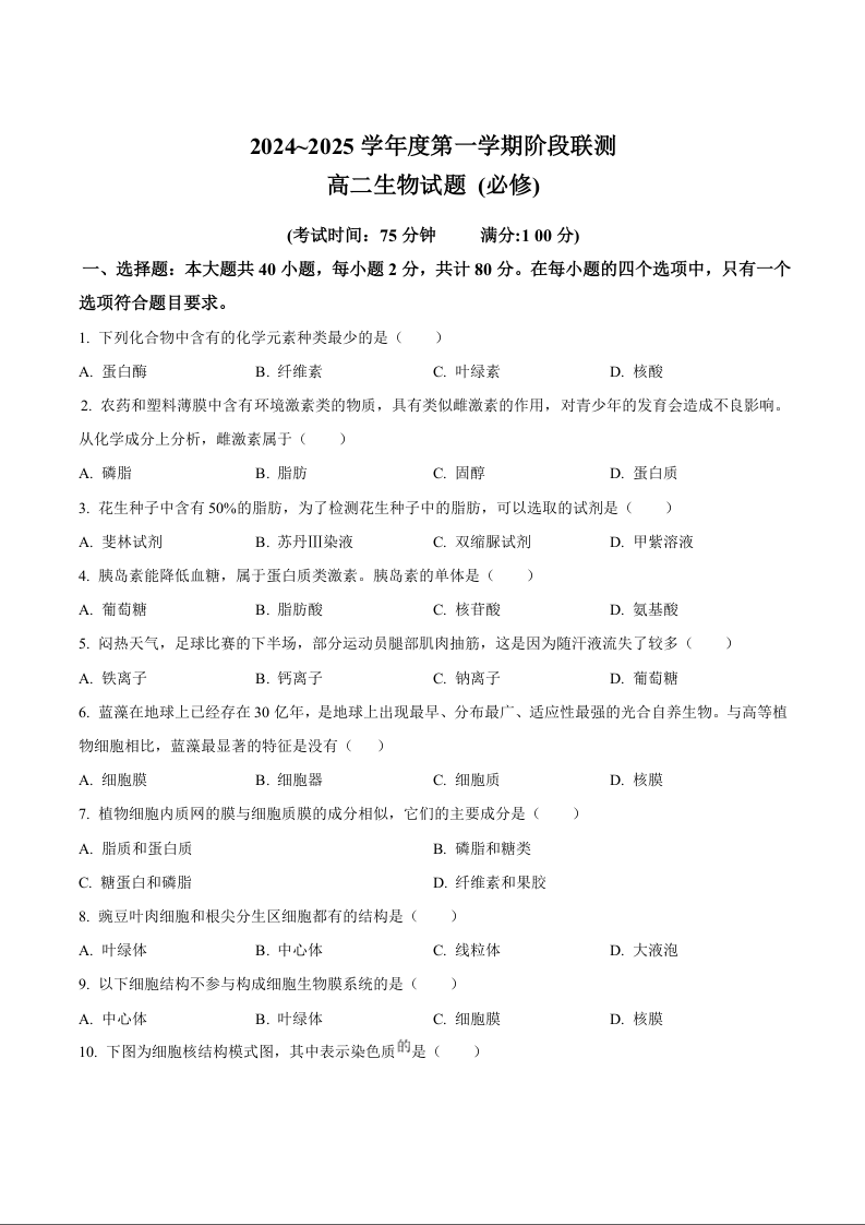 江苏省四市十一校联盟2024-2025学年高二上学期12月阶段联测生物+答案