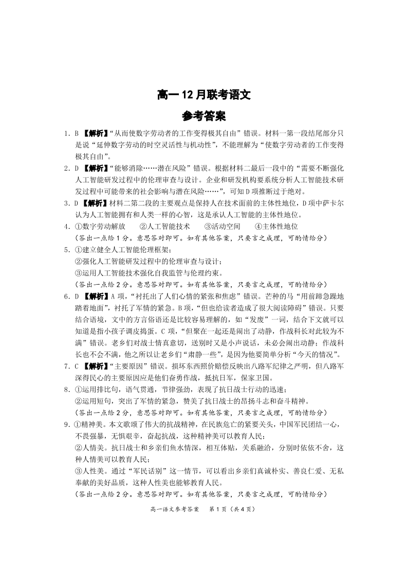湖北省武汉市问津教育联合体2024-2025学年高一上学期12月联考语文答案